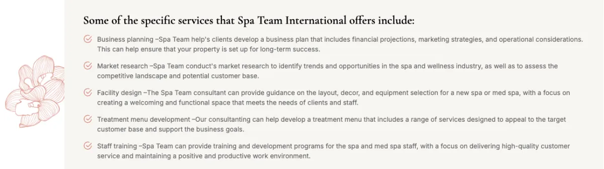 Is a service that provides guidance and expertise to individuals or businesses looking to establish or improve their resort, wellness center, spa or med spa business. Our Spa consultants have extensive experience in the spa and wellness industry, and they can provide insights and recommendations on a range of topics, including business planning, marketing, operations, and design.